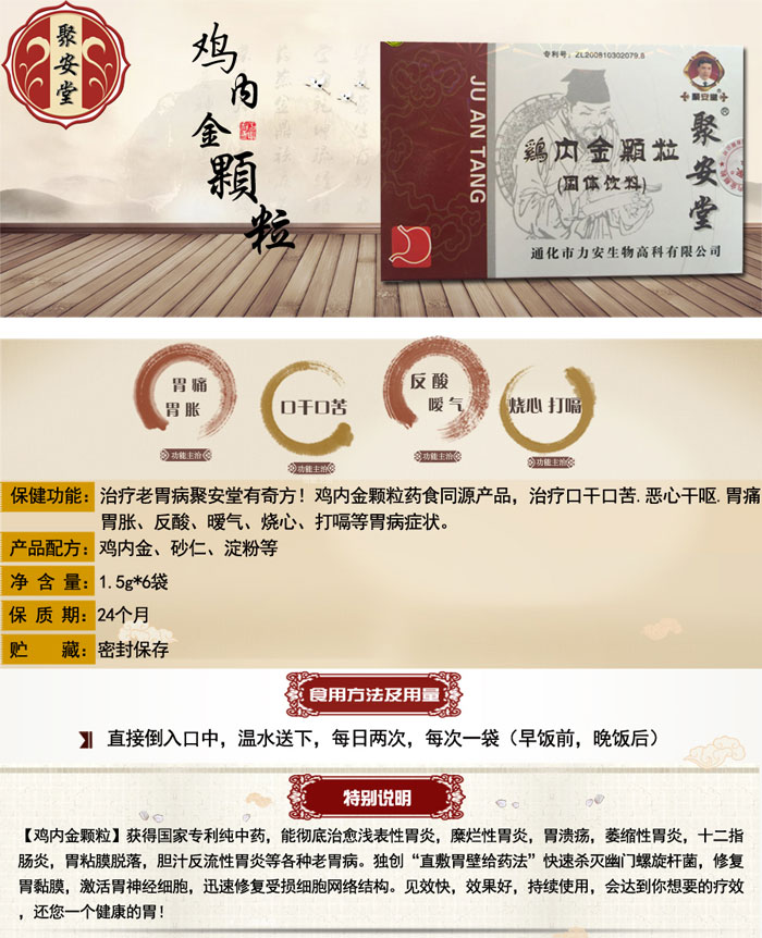 治疗老胃病聚安堂有奇方!鸡内金颗粒药食同源产品,治疗口干口苦.恶心干呕.胃痛胃胀.反酸.暧气.烧心.打嗝等胃病症状,【鸡内金颗粒】获得国家专利纯中药,能彻底治愈浅表性胃炎,糜烂性胃炎,胃溃疡,萎缩性胃炎,十二指肠炎,胃粘膜脱落,胆汁反流性胃炎等各种老胃病。独创“直敷胃壁给药法”快速杀灭幽门螺旋杆菌,修复胃黏膜,激活胃神经细胞,迅速修复受损细胞网络结构。见效快,效果好,持续使用,会达到你想要的疗效,还您一个健康的胃!